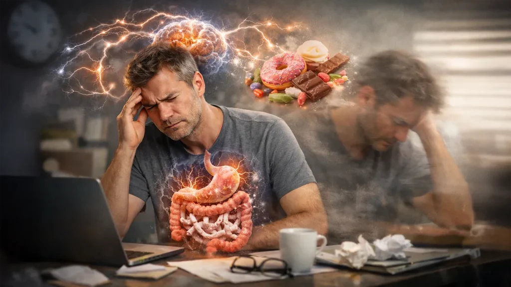 Najbardziej interesujące w tym wszystkim jest to, że zmiana w jelitach bardzo szybko zaczyna być widoczna… w głowie. Pojawia się: ciąg na słodkie, niestabilna energia, nagłe spadki koncentracji, dziwne „odcięcia”, których wcześniej nie było. I teraz ważne: to nie jest tylko kwestia psychiki. To jest sprzężenie. Candida żywi się cukrem. Środowisko sprzyja candidzie. Organizm zaczyna „chcieć” tego, co podtrzymuje to środowisko. To zamyka pętlę.