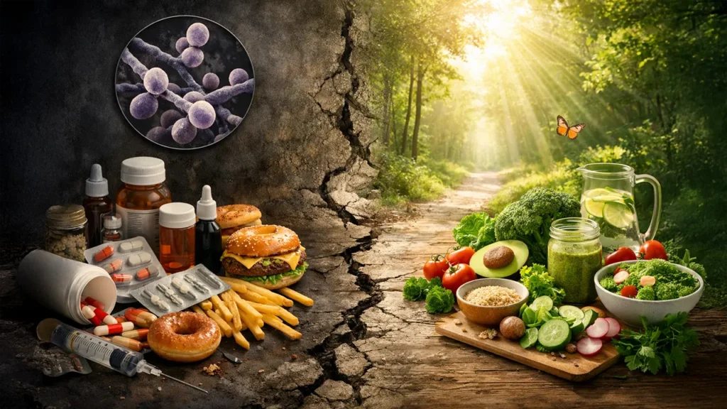 Największy błąd polega na tym, że próbuje się rozwiązać ten problem punktowo. Zabić candidę. Wziąć jeden preparat. Zastosować jedną dietę. To działa chwilowo, ponieważ ingeruje w jeden element układu, ale nie zmienia jego podstawowych warunków. Jeżeli środowisko pozostaje takie samo, organizm bardzo szybko wraca do poprzedniego schematu działania, ponieważ nic nie zmieniło jego logiki funkcjonowania. To dlatego wiele osób przechodzi przez kolejne „terapie”, które przynoszą poprawę na chwilę, ale nie rozwiązują problemu w sposób trwały.